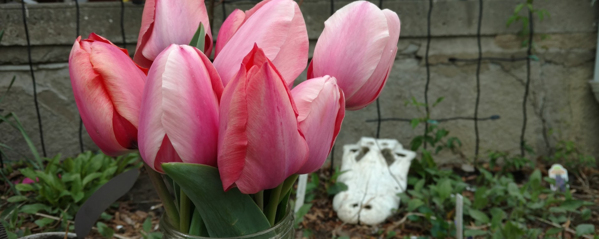 This was, IMO, the prettiest tulip bouquet of 2017. These deep pink tulips with black centers made a lovely display in the little mason jar.