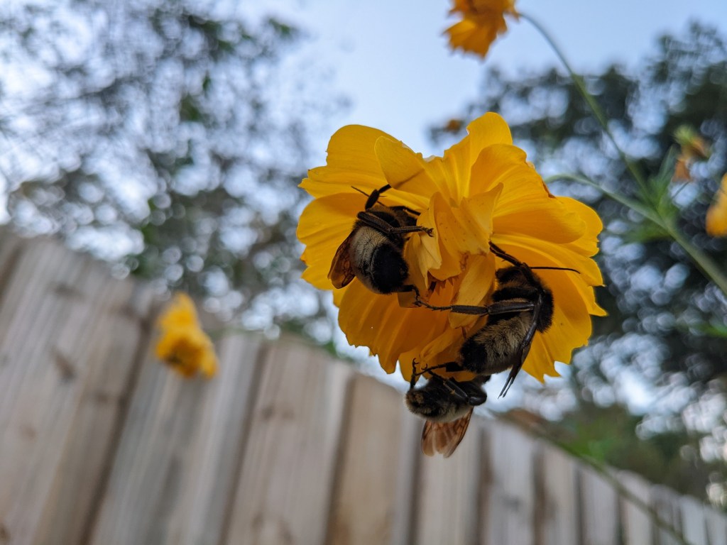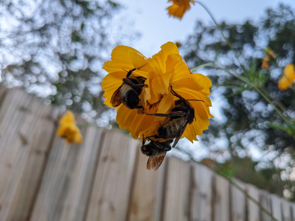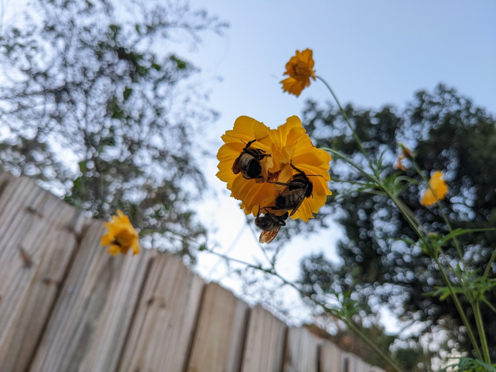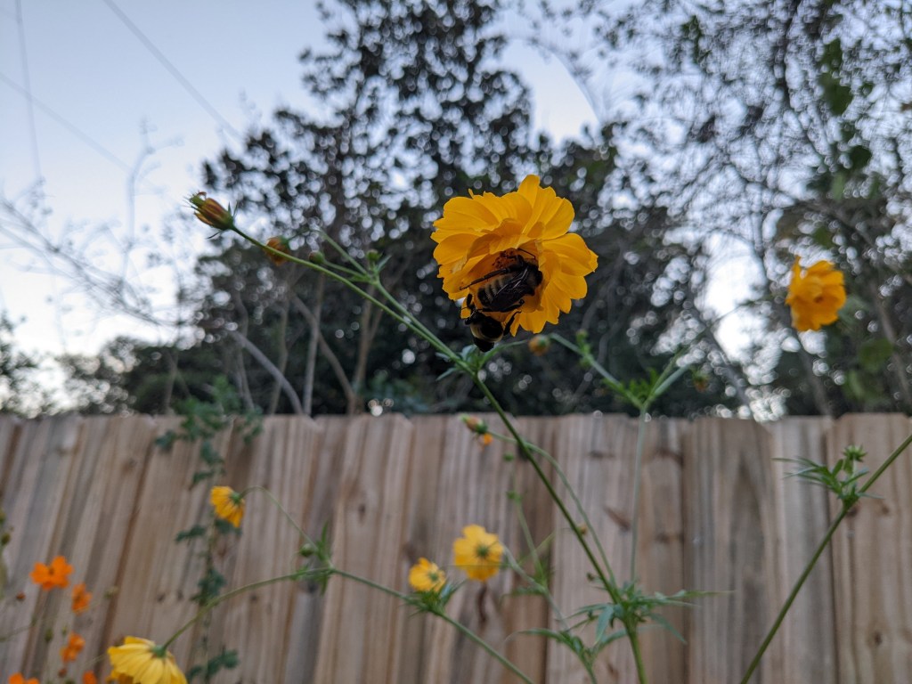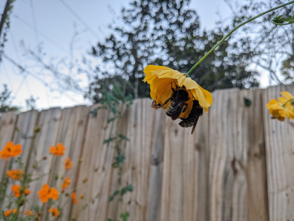 I found out that bumblebees sleep on cosmos. They are adorable. It kind of looks like a bumblebee hotel.