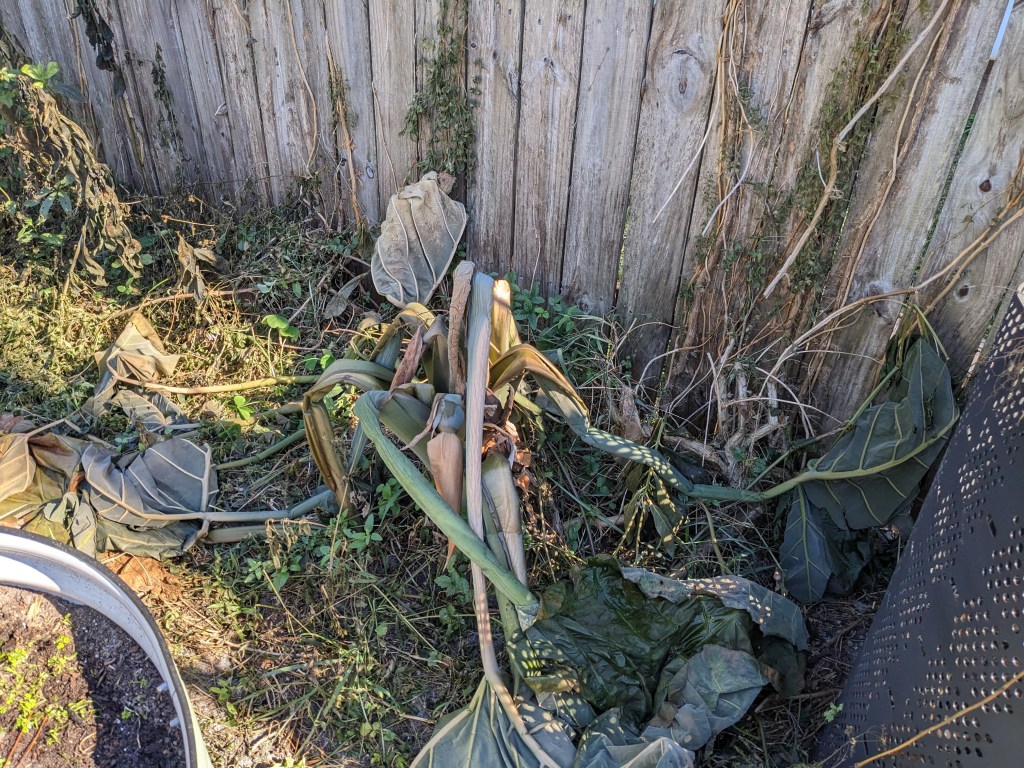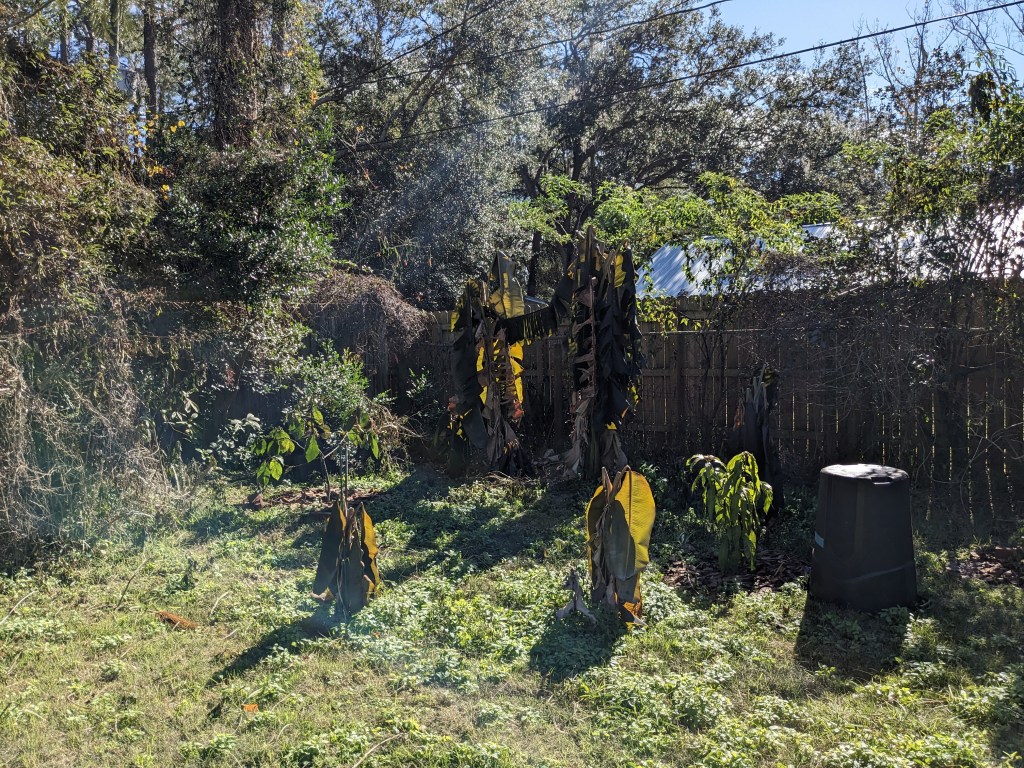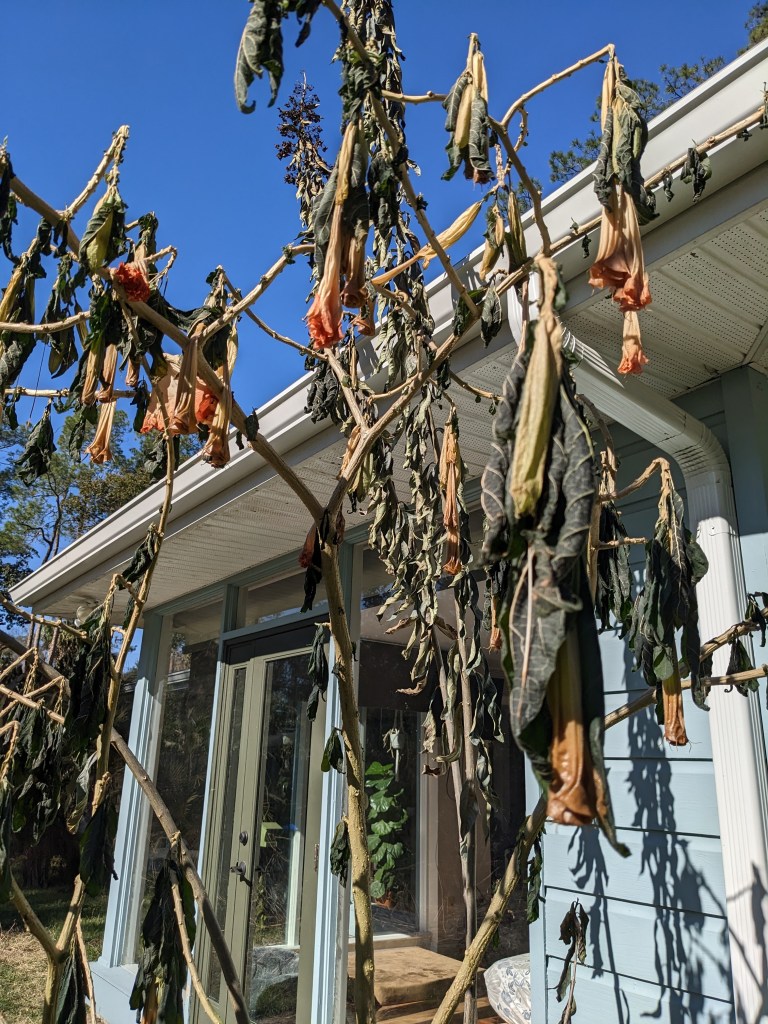 We’ll see what comes out of the sad mess that was bananas, guava, avocados, and mangos. When spring gets here next month I’ll cut back that which does not green back up. Sigh. I did cover everything, but I think next time I’ll also make sure to water in better prior to the freeze. View some of the carnage below.